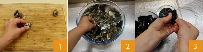 Para preparar o sautée de mexilhões e amêijoas, comece a purgar as amêijoas: elimine aquelas com a casca quebrada e bata uma a uma sobre uma tábua do lado da abertura 1. Se sair areia escura, significa que a amêijoa está cheia de areia e deve ser descartada. Depois, coloque as amêijoas em uma peneira apoiada sobre uma tigela e lave-as várias vezes em água corrente 2: termine quando não houver mais areia na tigela. Lave também os mexilhões, retire o biso, a barbicha que sai da casca 3 e raspe a concha com uma esponja para remover as impurezas.