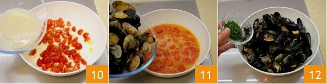 Cozinhe os tomates por alguns minutos, mexendo. Depois, despeje o líquido de cozimento dos moluscos 10 e deixe cozinhar por cerca de 5 minutos para secar. Em seguida, despeje os mexilhões e as amêijoas 11, cozinhe por mais 2-3 minutos, desligue o fogo e aromatize com salsa picada 12.
