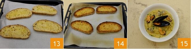 Para acompanhar o prato, você pode torrar no forno fatias de pão caseiro: regue as fatias de pão, coloque-as em uma assadeira forrada com papel manteiga e aqueça-as de ambos os lados em forno pré-aquecido a 220° por cerca de 10 minutos (se forno ventilado a 180° por 5 minutos) (13-14). Agora que todos os ingredientes estão prontos, despeje nas tigelas de servir o creme de grão-de-bico e por cima o sautée de mexilhões e amêijoas, algumas sem casca e outras inteiras 15. Sirva o creme de grão-de-bico com sautée de mexilhões e amêijoas com as torradas de pão!