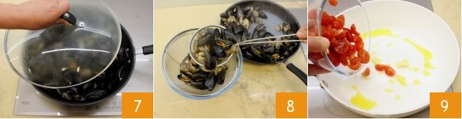 Cubra com uma tampa e deixe abrir 7: levará poucos minutos. Assim que se abrirem os mexilhões e as amêijoas, escorra-os e mantenha-os aquecidos 8; guarde também em uma tigela o líquido que os moluscos liberaram ao se abrirem. Em uma frigideira ampla, despeje o azeite, o alho amassado e os tomates 9.