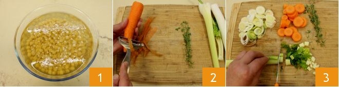 Para preparar o creme de grão-de-bico, você deve cuidar de colocar os grãos-de-bico secos de molho por pelo menos 12 horas (pode fazer isso na noite anterior). Em seguida, prepare os outros vegetais: corte e descasque a cenoura 2, prepare o aipo, o alho-poró e o tomilho. Fatie todos os vegetais 3 e pegue as folhinhas dos ramos de tomilho.