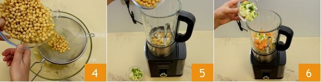 Escorra os grãos-de-bico 4 da água de molho. Depois, despeje a água no steamblender até atingir a capacidade máxima, e no copo, coloque os grãos-de-bico 5, o alho-poró, as cenouras e o aipo 6.