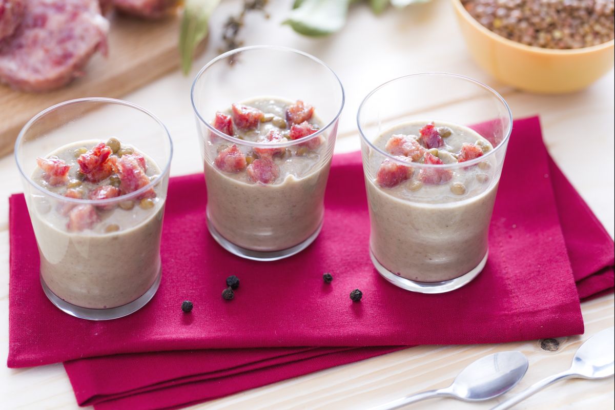 O creme de lentilhas com cubinhos de cotechino crocante é uma ideia simpática e inovadora para surpreender seus convidados, propondo uma maneira diferente de comer o Cotechino com lentilhas no dia de Ano-Novo, talvez reaproveitando os ingredientes que sobraram da noite anterior.