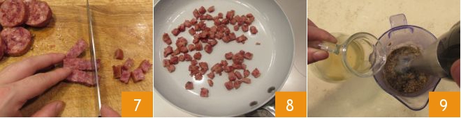 Quando as lentilhas estiverem quase cozidas, prossiga com o cotechino. Retire a pele e corte-o em cubinhos de 3-4 mm 7. Em seguida, frite o cotechino na frigideira, sem adicionar óleo, por 5-6 minutos, até ficar crocante 8. Depois mantenha-o aquecido e cuide do creme. Transfira para uma tigela de bordas altas as lentilhas cozidas, reservando uma colherada. Bata com um mixer de imersão, acrescentando aos poucos o caldo que você reservou 9.