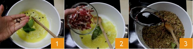 Para preparar o creme de lentilhas com cotechino crocante, comece cozinhando as leguminosas. Refogue em uma panela antiaderente, em fogo baixo, a cebola bem picada com o óleo, então acrescente as folhas de louro, as bagas de zimbro e os cravos-da-índia 1. Corte bem fina a pancetta defumada em tirinhas e junte-a à cebola 2. Adicione as lentilhas secas e deixe que absorvam o tempero por alguns instantes; depois regue com vinho tinto 3.