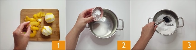 Para preparar o creme de limão sem ovos, a primeira coisa a fazer é lavar bem os limões e secá-los. Usando um descascador, retire apenas a casca, sem pegar a parte branca 1. Em uma panela, coloque o açúcar e o amido de milho 2, misture com uma espátula ou uma colher 3.