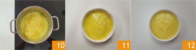 Misture e elimine as cascas de limão 10. Transfira o creme para uma tigela 11, cubra com filme plástico em contato e deixe esfriar primeiro em temperatura ambiente e depois na geladeira antes de usar 12. Para um creme mais fluido, antes de usá-lo, trabalhe alguns segundos com um batedor.