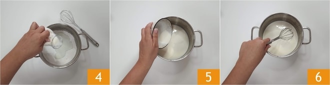 Adicione o leite aos poucos 4 mexendo para não criar grumos. Adicione também o creme de leite fresco 5 e misture novamente com um batedor 6.