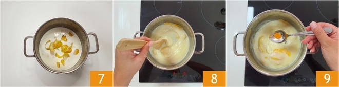 Adicione as cascas de limão 7 e cozinhe o creme em fogo muito baixo, até que engrosse 8. Retire do fogo e adicione uma pitada de cúrcuma 9 para colorir o creme de amarelo.