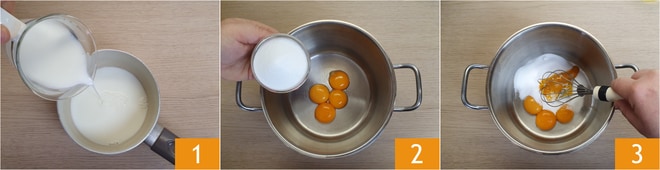 Para preparar o creme de Nutella, coloque o leite em uma panela 1, acenda o fogo e leve para ferver. Enquanto isso, em outra panela, bata as gemas com o açúcar 2 3 até obter um composto claro, fluido e homogêneo.