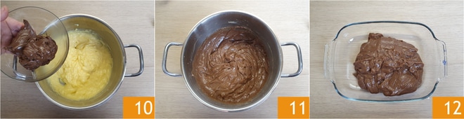 Retire a panela do fogo e incorpore imediatamente a Nutella 10, enquanto o creme ainda está quente. Misture vigorosamente para que seja absorvida completamente 11. Despeje o creme pronto em uma travessa baixa e larga 12 e cubra com filme plástico em contato. Deixe o creme esfriar completamente, em temperatura ambiente, antes de usá-lo: basta remover o filme plástico e revigorá-lo, misturando com o batedor energicamente por alguns minutos. O creme de Nutella está pronto para ser usado em suas preparações.