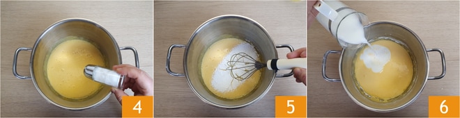 Adicione uma pitada de sal 4, incorpore também o amido de milho peneirado 5, alternando com cerca de um copo de leite quente, retirado daquele que está no fogo 6. Misture com o batedor para obter uma consistência lisa e homogênea.