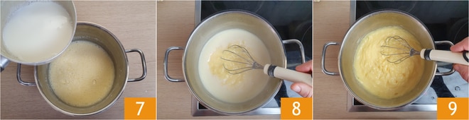 Assim que o leite estiver quase fervendo, despeje-o todo dentro do composto de gemas 7 e leve novamente ao fogo, em chama moderada. Continue mexendo 8 até que o creme engrosse 9.