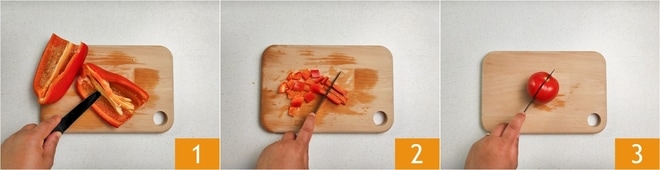 Para preparar o creme de pimentão, comece pelos próprios pimentões. Limpe-os removendo o caule, depois corte-os ao meio no sentido do comprimento e elimine também as sementes e os filamentos internos 1. Em seguida, corte-os em cubos 2. Limpe também os tomates, corte-os ao meio 3 e elimine a parte do caule.