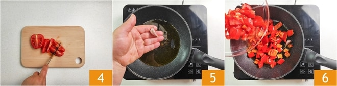 Em seguida, corte os tomates em cubos 4. Despeje o óleo na frigideira, adicione um dente de alho com casca 5 e deixe fritar. Junte então os pimentões e os tomates 6, depois ajuste o sal.
