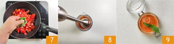Aromatize com algumas folhas de manjericão rasgadas grosseiramente 7 e cozinhe em fogo médio com a tampa por 15 minutos, mexendo de vez em quando. Quando os pimentões estiverem cozidos, retire o dente de alho e coloque-os em um copo alto. Bata com um mixer de imersão 8 até obter um creme denso e aveludado. Transfira o creme de pimentão para um pote 9 e conserve na geladeira até o uso.