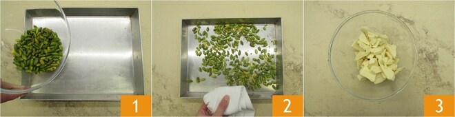 Para descascar os pistaches facilmente, escalde-os em água por alguns segundos. Depois, descasque-os à mão.