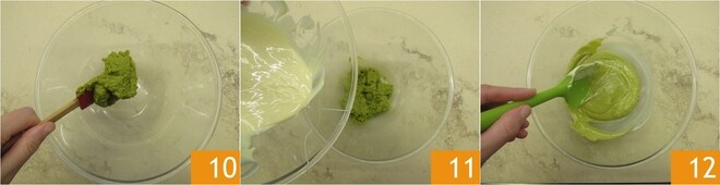 Transfira a mistura obtida para uma tigela 10, adicione o chocolate branco 11 e misture energicamente até obter uma mistura homogênea 12.