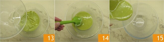 Adicione o restante do óleo de semente de uva 13 e misture novamente até obter uma mistura homogênea 14. Nesse ponto, transfira para uma tigela resfriada no congelador e um pouco limpa de condensação 15.