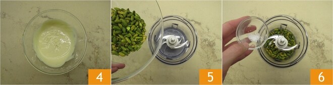 Para preparar o creme de pistache, coloque os pistaches descascados em uma assadeira 1. Torre-os em forno estático pré-aquecido a 185° por 10 minutos, depois retire do forno e deixe esfriar 2. Enquanto isso, pique grosseiramente o chocolate branco e transfira-o para uma tigela 3.