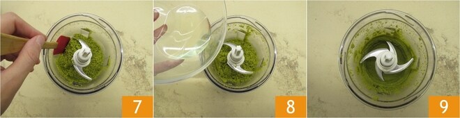 Triture-os em várias etapas, até obter uma farinha 7. Adicione uma pequena parte do óleo de semente de uva 8 e acione novamente as lâminas até obter um purê cremoso 9. Para facilitar o trabalho, de vez em quando limpe as paredes do mixer empurrando a mistura com uma espátula. Isso levará cerca de 5-6 minutos. É fundamental não aquecer muito a mistura, ela não deve exceder 45°, por isso é importante parar frequentemente. Se necessário, deixe descansar na geladeira por alguns minutos e comece novamente.
