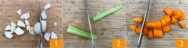 Para fazer o creme de repolho e batata, primeiro prepare cerca de 1,5 l de caldo de legumes e mantenha-o quente; à parte, limpe e corte grosseiramente as cebolas 1 e o salsão 2. Em seguida, limpe, apare e corte também a cenoura 3.