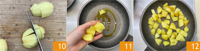 Enquanto isso, descasque e corte as batatas em cubos 10. Doure as batatas em uma frigideira com um fio de azeite por alguns minutos 11 12.