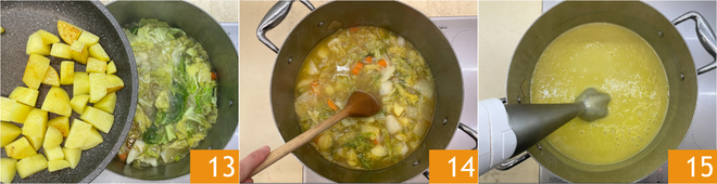 Quando o caldo começar a ferver, junte as batatas 13, ajuste o sal e tampe. Deixe cozinhar em fogo baixo por cerca de 30 minutos. Passado esse tempo 14, desligue o fogo e bata tudo com um mixer de mão 15.