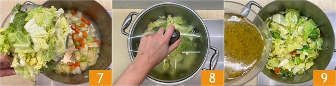 Junte o repolho na panela 7, tampe e deixe cozinhar por alguns minutos 8. Quando o repolho tiver reduzido de volume, adicione o caldo de legumes quente 9.
