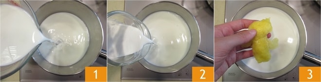 Para preparar o creme mousseline, a primeira coisa que você deve fazer é despejar em uma panela o leite 1 e o creme de leite 2. Adicione a casca de limão 3.