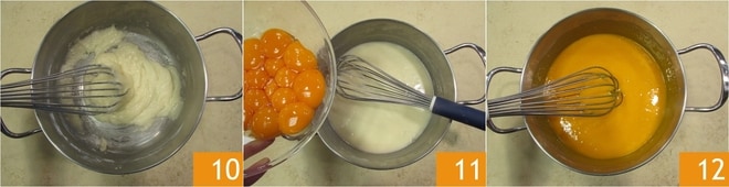 Misture com o batedor até obter uma espécie de molho bechamel sem grumos 10. Neste ponto, adicione as gemas 11 e misture com o batedor 12.