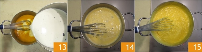 Despeje o leite restante 13, mexendo com o batedor. Leve novamente ao fogo e continue a mexer 14 até engrossar 15.