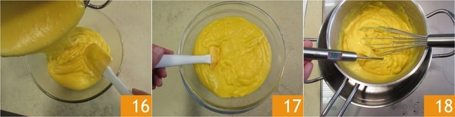 Assim que começar a ferver, desligue o fogo e transfira o creme para uma tigela 16. Coloque essa tigela em banho-maria com água e gelo. Misture a cada 2-3 minutos para resfriá-lo. Quando o creme estiver frio, aqueça-o no micro-ondas ou em banho-maria 18 até atingir uma temperatura de 26°.