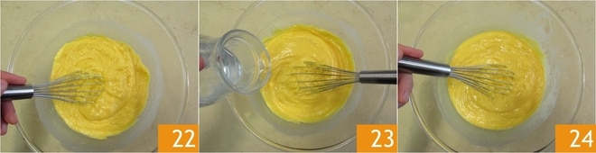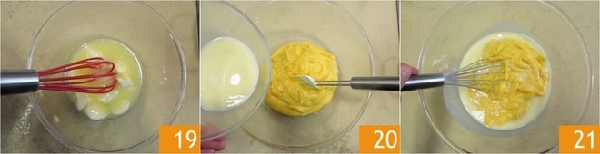Faça o mesmo com a manteiga, mergulhando-a brevemente na água do banho-maria e misturando até atingir a temperatura de 26° 19. Despeje a manteiga dentro do creme 20 e misture bem com um batedor 21.