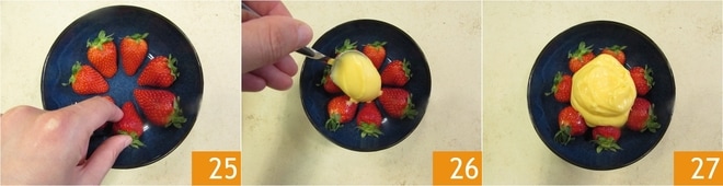 Para saboreá-lo puro, você pode simplesmente dispor alguns morangos em um pratinho 25, adicionar o creme mousseline por cima 26 e servir 27!
