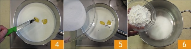 Junte também as sementes da fava de baunilha 4 e metade da quantidade de açúcar 5. Depois, leve à fervura em fogo baixo. Em outra panela, misture o açúcar restante e o amido de milho, previamente peneirado 6.