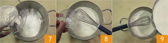 Adicione a farinha, também peneirada 7 e uma pitada de sal 8. Misture com o batedor e, assim que o leite começar a ferver, despeje uma pequena parte dentro das misturas secas 9.