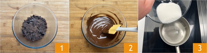 Para preparar a creme para pandoro de chocolate, primeiro pique o chocolate amargo com uma faca e coloque-o em uma tigela 1. Derreta o chocolate no micro-ondas ou em banho-maria 2 e deixe amornar. Em uma panela, coloque a água e o açúcar 3, depois aqueça até atingir a temperatura de 121°.