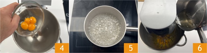 Enquanto isso, coloque as gemas na tigela da batedeira 4. Se você não tiver um termômetro de cozinha, saberá que a calda atingiu a temperatura quando bolhas brancas se formarem na superfície 5. Comece a bater as gemas e despeje a calda em fio, quando atingir a temperatura 6. Continue batendo por 5 minutos, até o resfriamento da mistura.