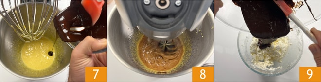 Neste ponto, adicione o chocolate morno à batedeira 7 e trabalhe por mais 3 minutos 8. Coloque o mascarpone em uma tigela e amoleça-o com um batedor, depois adicione a mistura de chocolate 9.