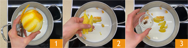 Para preparar o creme para panetone, primeiro aqueça o leite em uma panela junto com a casca da laranja 1, a casca do limão 2 e as sementes da vagem de baunilha 3.