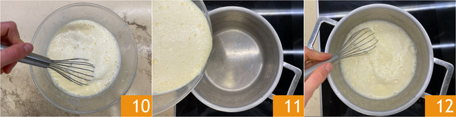 Você deve obter uma mistura homogênea 10. Neste ponto, leve-a de volta à panela 11 e deixe engrossar em fogo médio-baixo, mexendo continuamente 12.