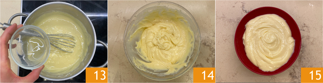 Uma vez que o creme tenha engrossado, desligue o fogo e aromatize com o cointreau 13. Misture bem para incorporá-lo de forma homogênea. Transfira o creme para uma tigela e deixe esfriar completamente 14. Seu creme para panetone está pronto para ser apreciado 15!