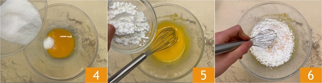 Enquanto isso, coloque as gemas e o açúcar em uma tigela 4 e misture com um batedor 5, depois acrescente o amido de milho 5 e misture novamente 6.