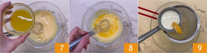 Adicione o suco de laranja 7 e misture com o batedor 8, depois despeje o leite quente aos poucos, coando através de uma peneira 9.