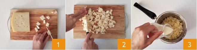 Para preparar o creme salgado com cogumelos e bacon, primeiro corte o Asiago em cubos 1 e depois pique-o com a faca 2. Transfira o queijo para uma panela, despeje o leite e o creme de leite aqui 3
