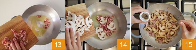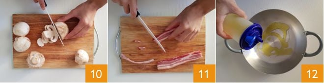 Fatie finamente os cogumelos 10 e depois corte o bacon em cubos 11. Despeje um fio de azeite em uma frigideira 12