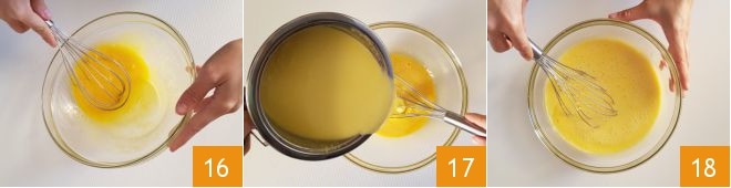 Em uma tigela, bata as gemas de 5 ovos com o ovo inteiro 16, adicione a mistura ao creme já frio 17 e misture bem para incorporar 18.