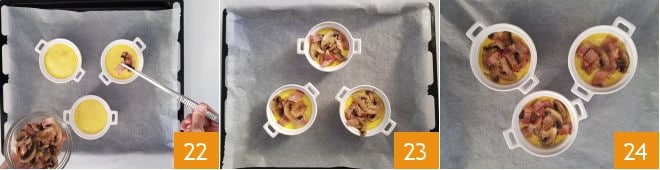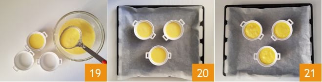 Agora distribua a mistura em cocottes de forno 19, coloque-as em uma assadeira 20 e asse em forno ventilado pré-aquecido a 150° por 20 minutos na prateleira do meio. Após esse tempo, retire as cocottes 21