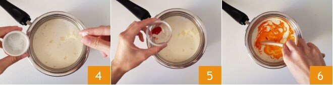 Adicione uma pitada de sal 4, o açafrão em pó 5 e misture com uma colher 6.